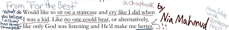 In Fall of 2022, in the midst of resisting putting together a collection, I knew what the title was. I don’t rush my titles. They appear to me early on in my writing process, but I don’t beg for them. At this point, I had half of a first draft. Themes had started to emerge. Grief for endings and beginnings. The way aches change when you study them. Wanting. Wanting, and wanting, and wanting, with a fury my metaphors couldn’t keep up with, and how time renders wants obsolete in the face of needs. For the Best. Everything I was learning and would learn was for the best. Once I had my title, I knew I needed to see it through. I wanted to challenge myself with interesting ideas, imagery, and formats.